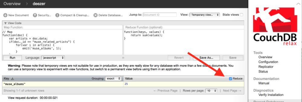 - Compute the total number of the albums produced by the rock band Muse —use the reduce check button (see figure). If it does not appear refresh the page.